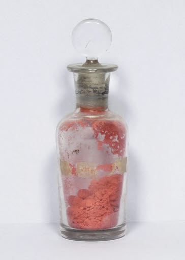 Originalment portava una etiqueta amb el nom del producte que el recipient estava destinat a contenir, aquesta s'ha perdut, només resta l'adhesiu, però es trobava documentada a la fitxa antiga en paper: "Ioduro de mercurio" (diiodur de mercuri, deutoiodur de mercuri o iodur mercúric).
