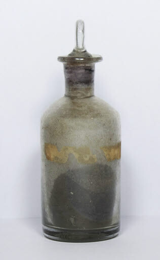 Originalment portava una etiqueta amb el nom del producte que el recipient estava destinat a contenir, però aquesta s'ha perdut. S'observen restes d'adhesiu a la part frontal del recipient, probablement de l'antiga etiqueta.