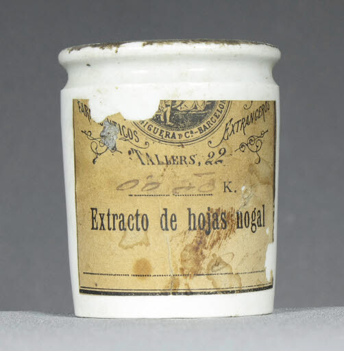 Porta una etiqueta comercial de la Sociedad Farmacéutica Española, de Barcelona, que també indica el producte que el recipient estava destinat a contenir: extracte de fulles de noguera.