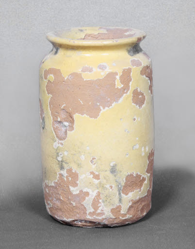 Pot quasi cilíndric amb l'espatlla inclinada, estrangulament a la boca i vora exvasada, amb llavi arrodonit. Esmaltat en ocre.