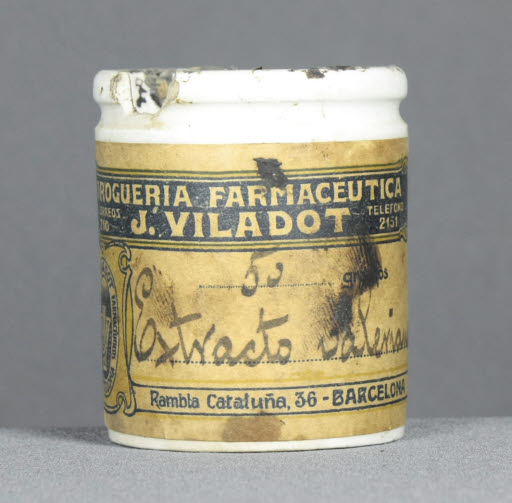 Inscripció etiqueta: "DROGUERÍA FARMACÉUTICA / J. VILADOT / A. CORREOS / 210 / TELEFONO / 2151 / 50 gramos / Extracto valeriana / Rambla Cataluña, 36 - BARCELONA / JV / MARCA / REGISTRADA / J. VILADOT / PRODUCTOS / FARMACEUTICOS / BARCELONA", impresa i manuscrita.