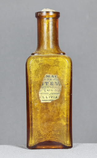 Flascó de vidre de color topazi, de cos quadrangular amb els angles bisellats, coll cilíndric llarg i ample, boca amb llavi gruixut i tap de suro.
