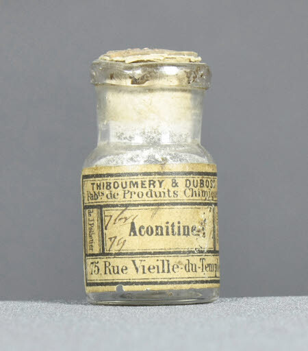 Porta una etiqueta comercial de la fàbrica de productes químics Thiboumery & Dubosc, de París, que també indica el producte que el recipient estava destinat a contenir: aconitina.