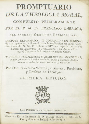 Inscripció: "COMPUESTO PRIMERAMENTE / POR EL P. M. FR. FRANCISCO LARRAGA, / DEL SAGRADO ORDEN DE PREDICADORES: / DESPUES REFORMADO, Y CORREGIDO EN ALGUNAS / de sus opiniones, é ilustrado con la explicacion de varias Cons- / tituciones de N. SS. P. BENEDICTO XIV. en especial de las que / hablan del Solicitante in Confessione::: del Ayuno, &c. / por el Convento de SANTIAGO del mismo Orden. / Y AHORA ULTIMAMENTE ACABADO DE REFORMAR, / añadir, y reducir á mejor methodo, orden y conexion de doc- / trinas en todos los demás tratados y materias. / Por Don FRANCISCO SANTOS, y GROSIN, Presbitero, / y Profesor de Theología.", impresa, tercera plana.