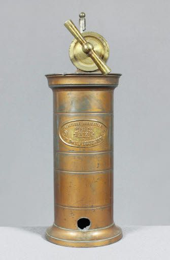 Aparell cilíndric amb aixeta de sortida a la part inferior (fragmentada) i proveït d'un èmbol interior acoplat a un dispositiu per donar pressió al líquid.