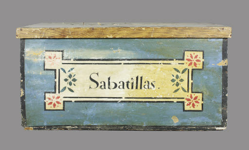 Presenta la cara frontal policromada en blau cel, blanc, verd, vermell i negre. Al centre, sobre una àmplia cartel·la rectangular, hi figura una inscripció que identifica l'espècie botànica que la caixa estava destinada a contenir: sabadilla, flanquejada per elements florals fets a trepa. Als quatre angles de la cartel·la també hi ha elements florals, inscrits en petits quadrats.