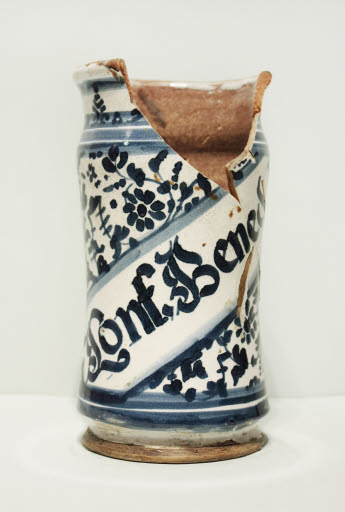 Argila modelada a torn, vidrada; decoració pisa estannífera en blau i blanc