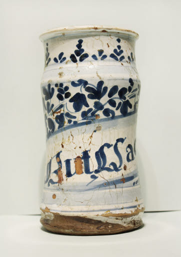 Argila modelada a torn, vidrada; decoració pisa estannífera en blau i blanc