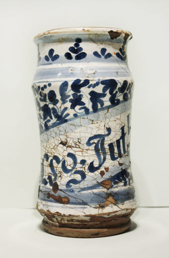 Argila modelada a torn, vidrada; decoració pisa estannífera en blau i blanc