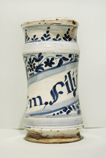 Pot de farmàcia tipus albarel. Es tracta d'un recipient de cos cilíndric, amb un lleu estrangulament central, boca ampla, amb llavi, i repeu. La decoració és de pisa estannífera (realitzada a partir d'estany) decorada en blau a base de petites fulles de julivert, que envaeixen tota la superfície de l'objecte, exceptuant l'espai frontal reservat a la cartel·la. Aquesta darrera, disposada en diagonal, mostra el nom en llatí, abreujat, del producte que estava destinat a contenir.