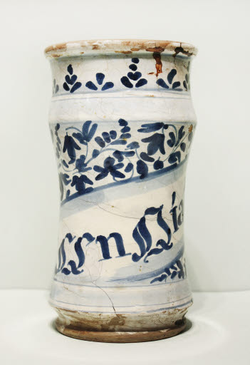 Argila modelada a torn, vidrada; decoració pisa estannífera en blau i blanc