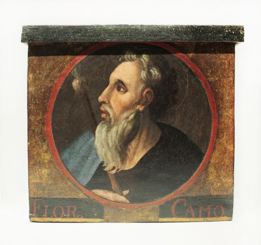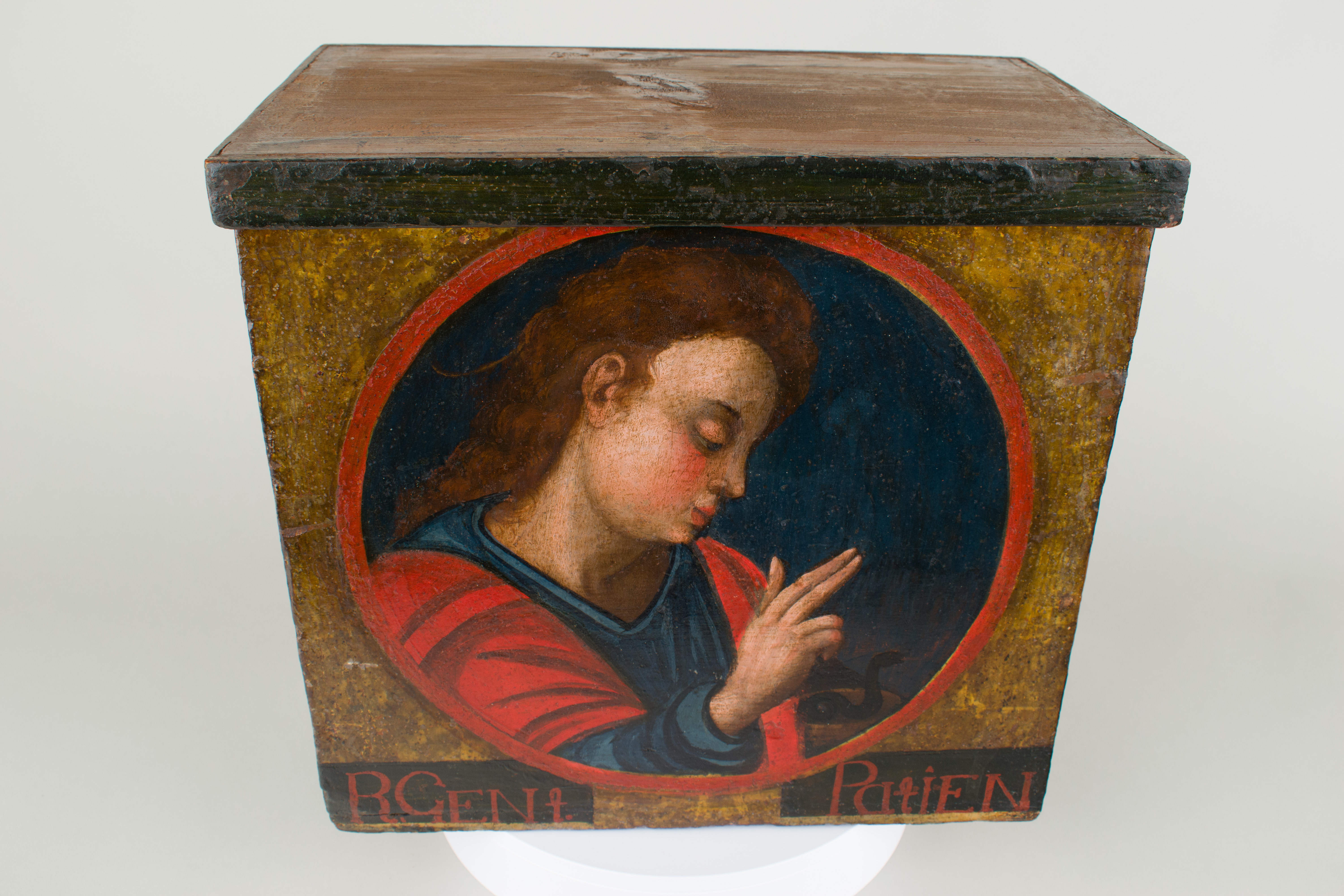 Caixa de fusta de cos paral·lelepipèdic, amb la base rectangular i tapa independent que tanca la part superior. Presenta la cara frontal daurada i policromada. Es representa un medalló delimitat per una franja de color vermell (tallat a la vora superior per la tapa), a l'interior apareix el bust de sant Tomàs apòstol (probablement), sobre un fons neutre de color marró. Està representat amb aurèola al cap, barba blanca i sostenint una llança amb la mà dreta, instrument que simbolitza el seu martiri.