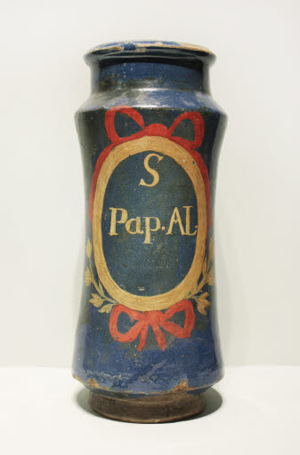 Pot de farmàcia tipus albarel. Es tracta d'un recipient de cos cilíndric, amb un lleu estrangulament central, espatlla i fons diferenciats per arestes, boca ampla, amb llavi, i repeu. És de ceràmica vidrada en blau cobalt per l'exterior i en blanc trencat per l'interior.