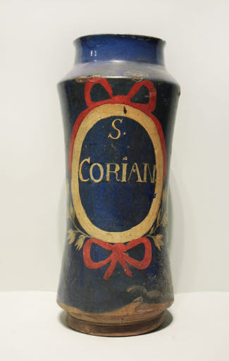 Pot de farmàcia tipus albarel. Es tracta d'un recipient de cos cilíndric, amb un lleu estrangulament central, espatlla i fons diferenciats per arestes, boca ampla, amb llavi, i repeu. És de ceràmica vidrada en blau cobalt per l'exterior i en blanc trencat per l'interior.