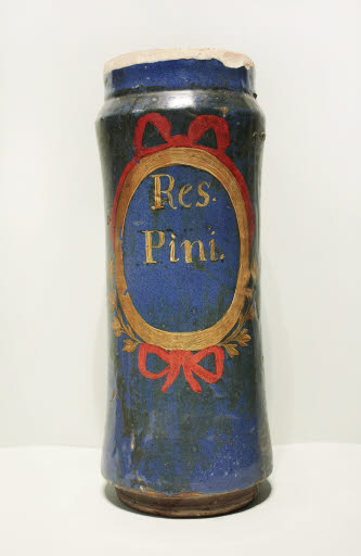 Tot i que aquest era el seu aspecte original, llis, cap a la segona meitat del segle XVIII es va decorar en fred amb pintura a l'oli ocre i vermella, seguint l'estètica dels anomenats "pots de Banyoles", que estaven de moda en aquell moment. Se li va afegir l'oval central, amb un llaç a la part superior i flanquejat per elements vegetals, estil Lluis XVI, i, a l'interior, el nom en llatí, abreujat, del producte que estava destinat a contenir: resina de pi, colofònia o pega grega.